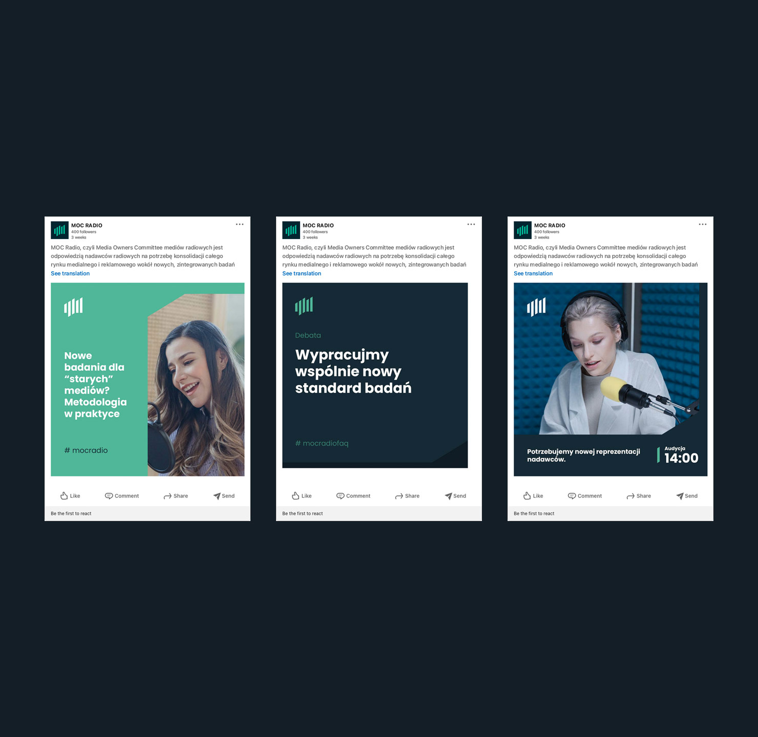 We also developed a graphics template for MOC Radio’s social media. We developed several possible content layouts so that at a later stage the client could create differentiated content on their SM channels on their own.
